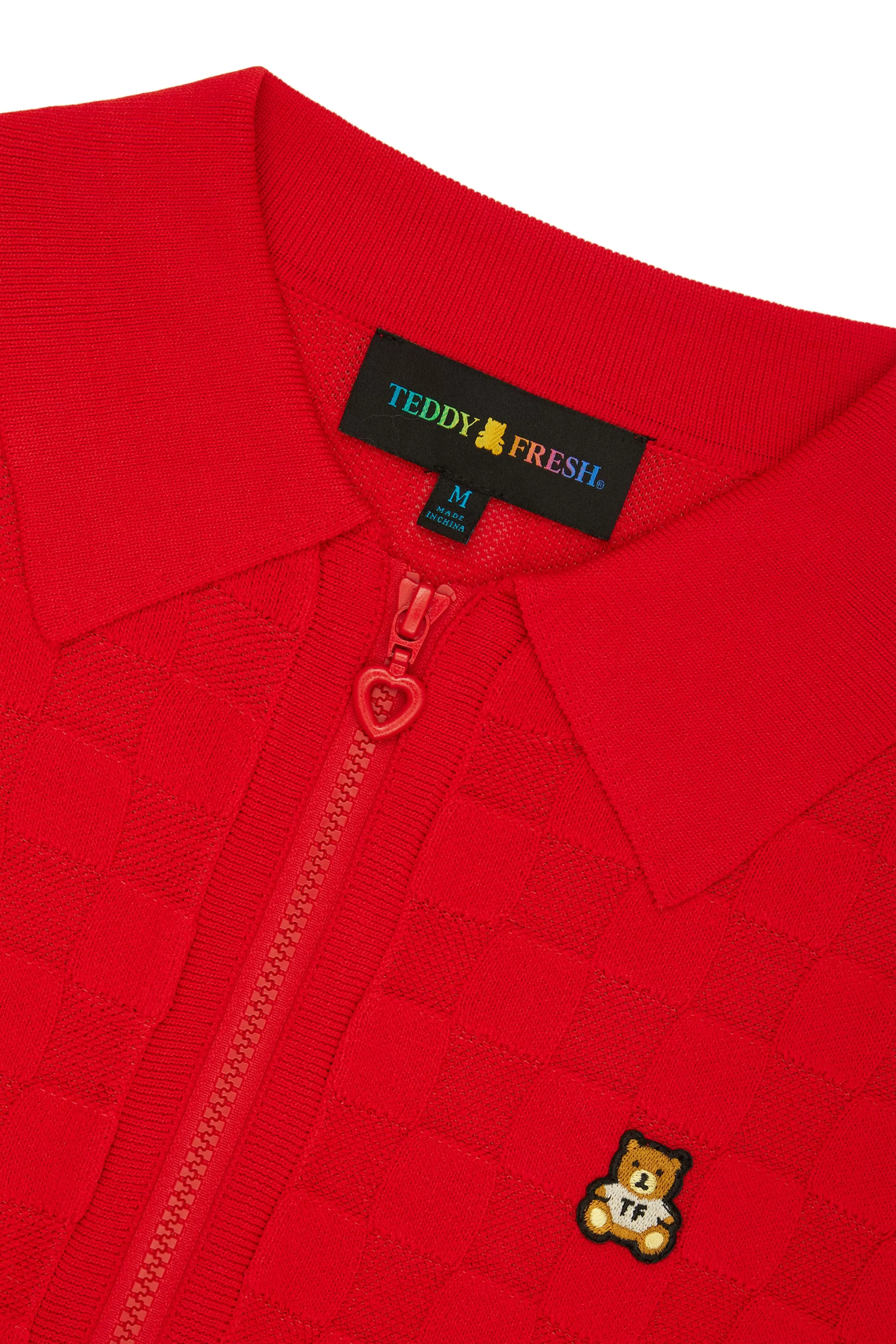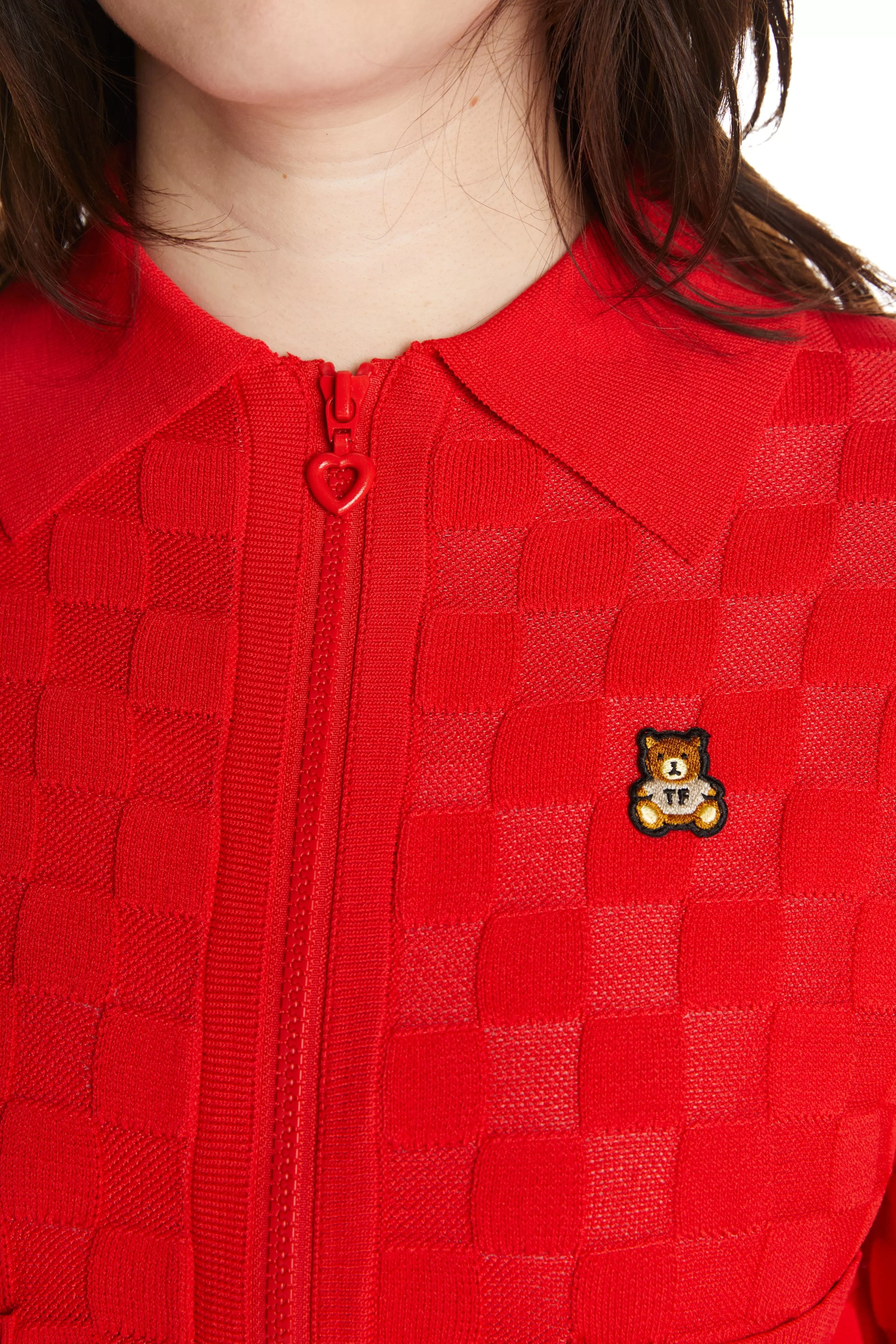 - Red colorway: painted enamel heart zipper pull