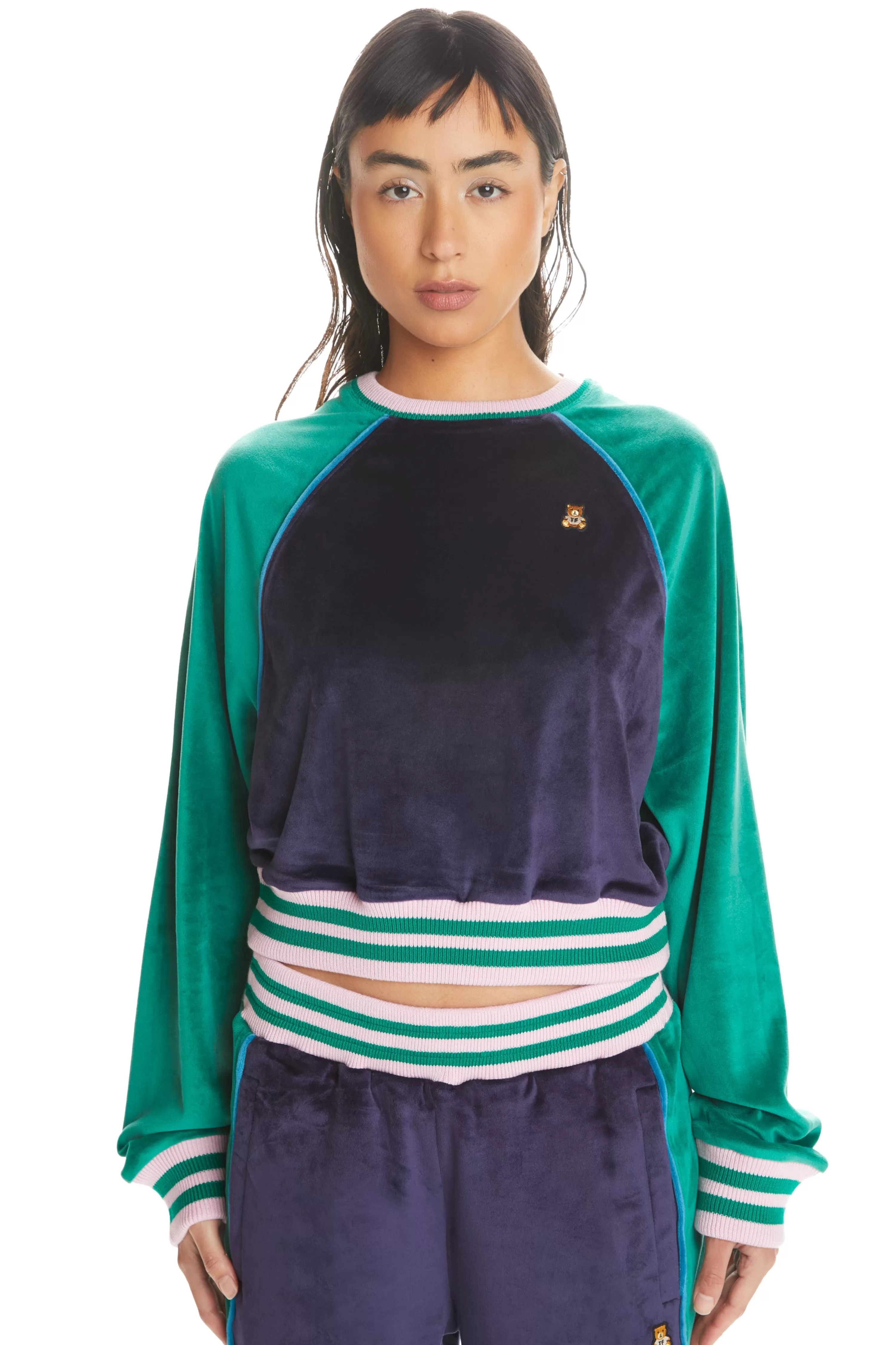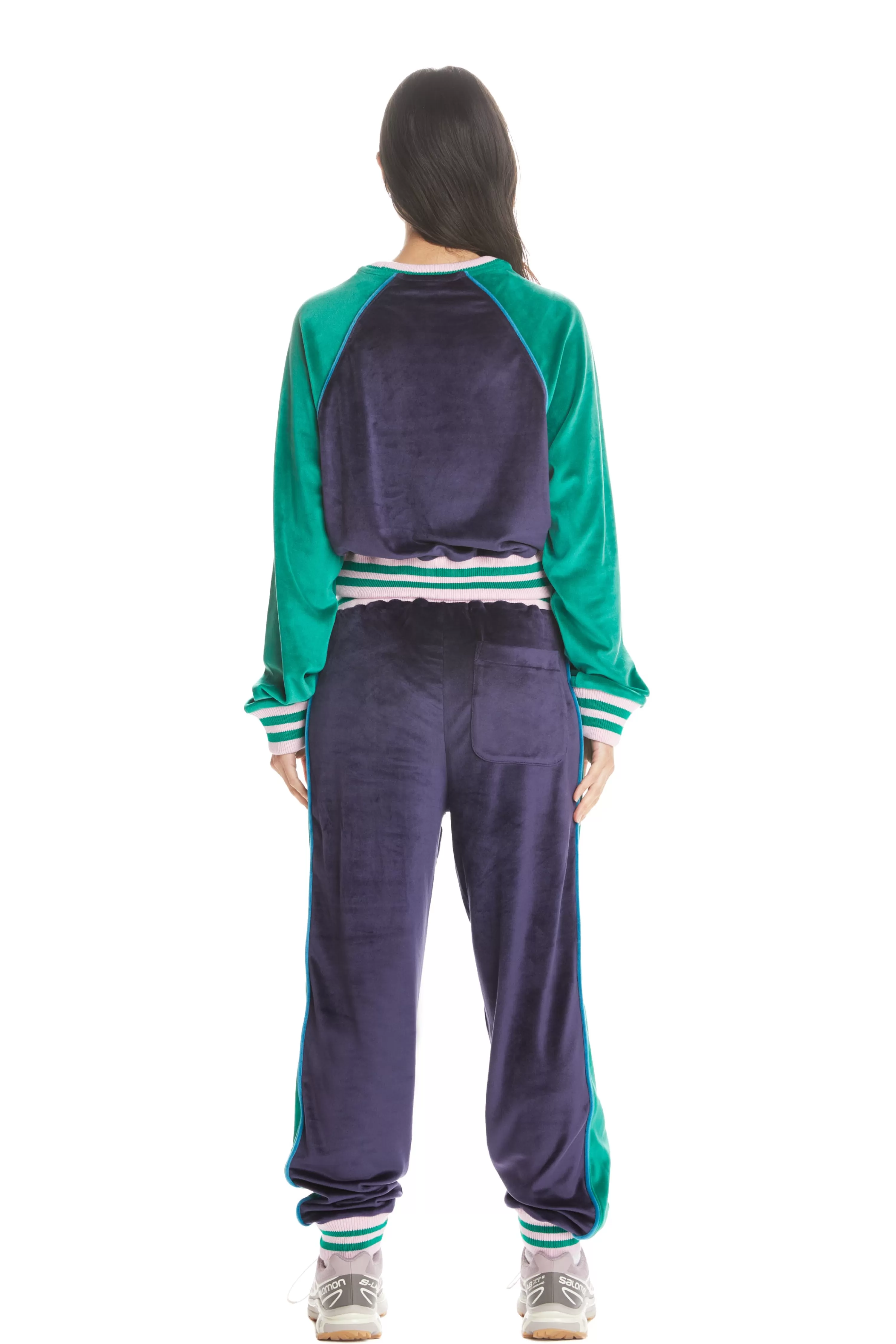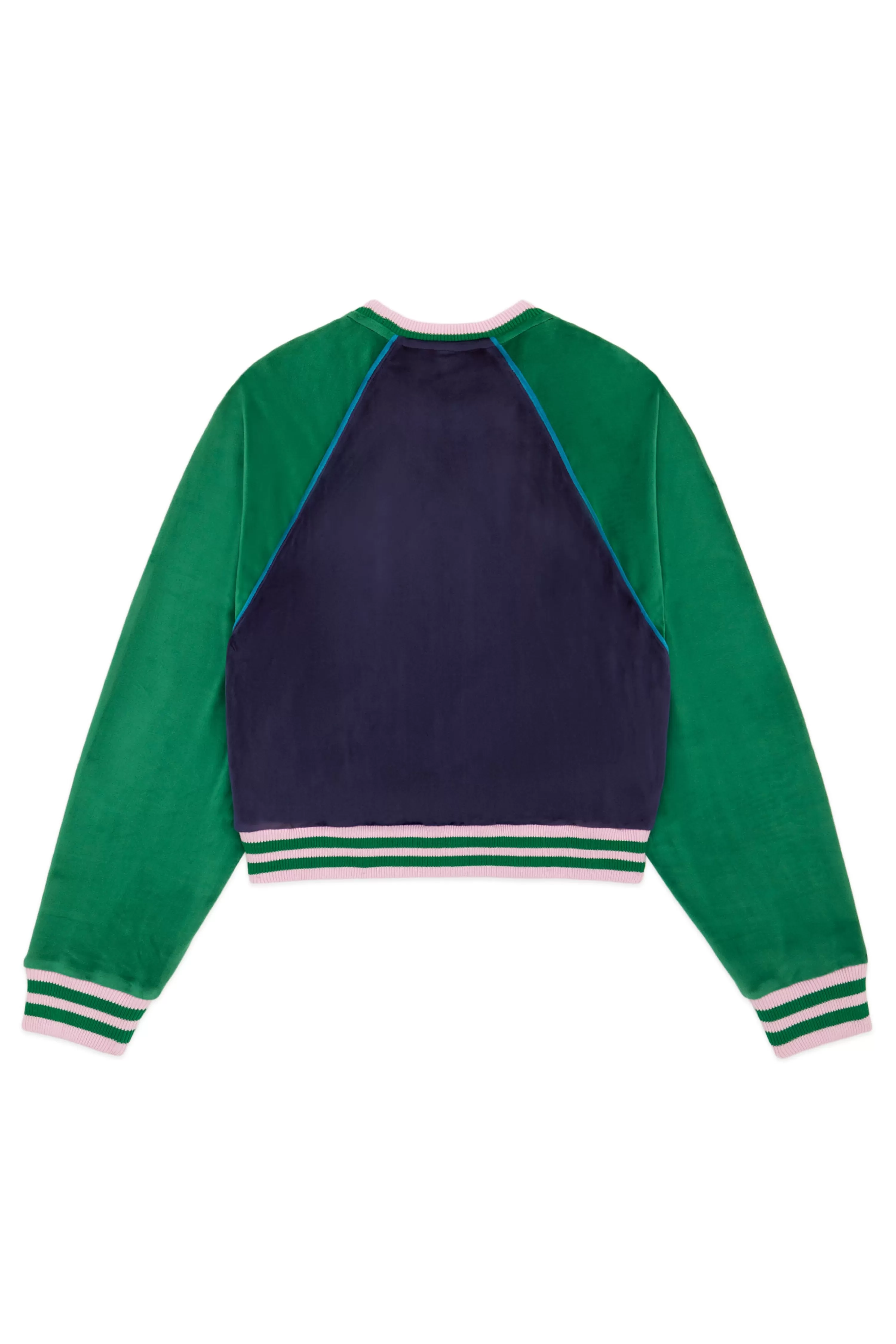 - Ribbed neckband, cuffs, and waistband with contrast stripes