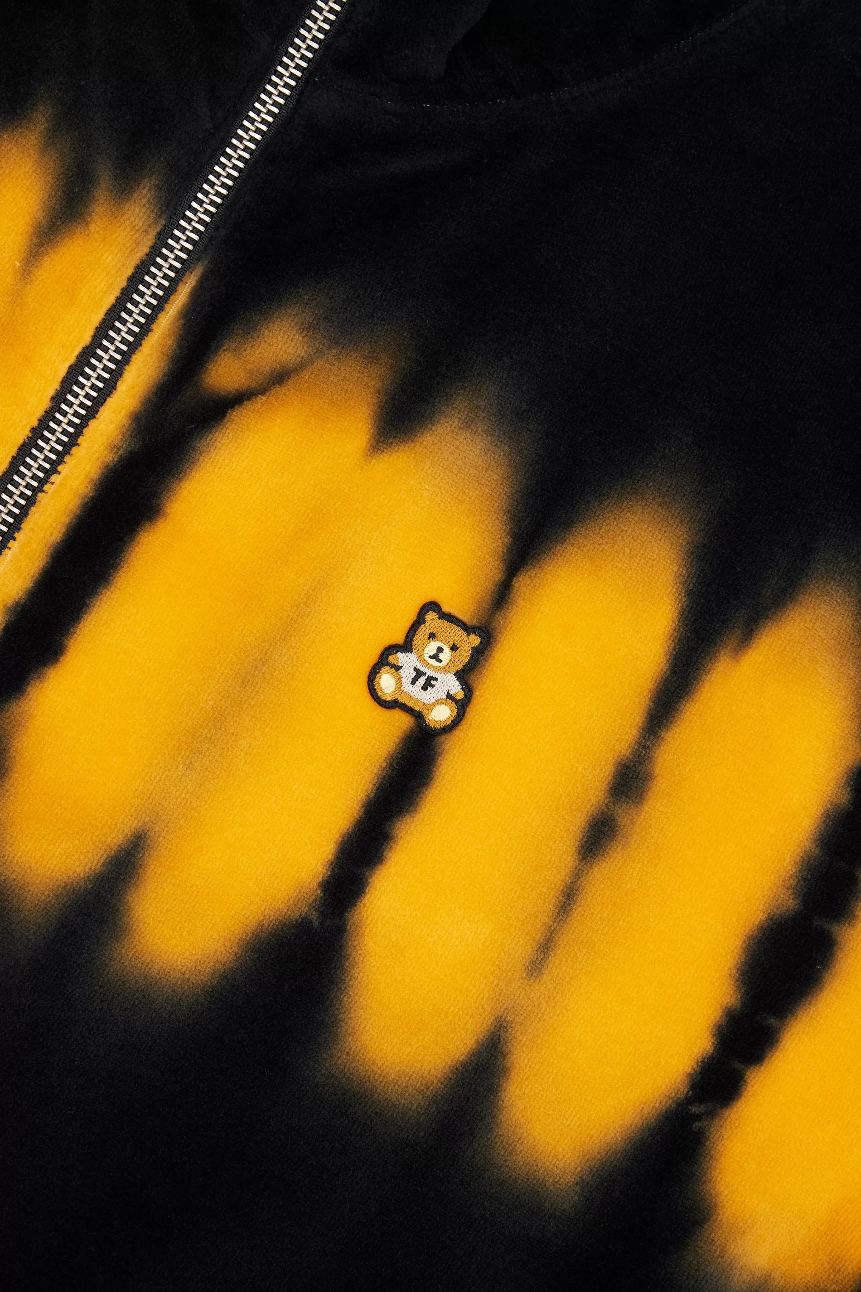 - Embroidered bear patch on chest